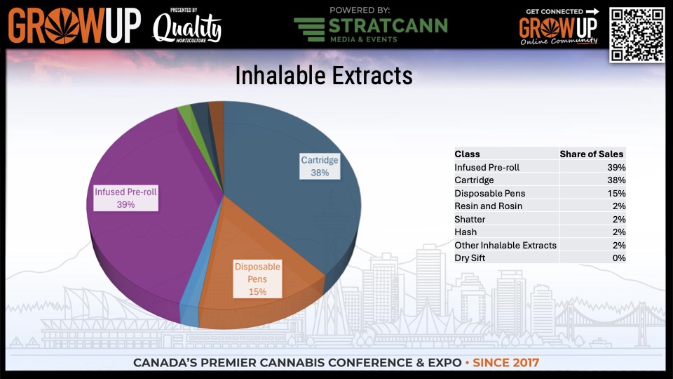 Within the inhalable extracts category, the top segments are: Infused Pre-Rolls (39%), Cartridge Vapes (38%), and Disposables (15%).