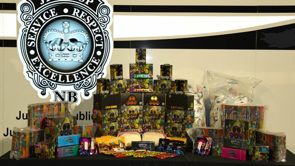 Images shared by NB Justice and Public Safety show a large amount of dried cannabis, along with package vapes and “copycat” edibles.