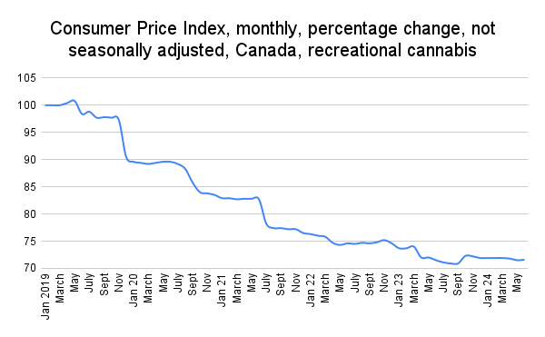 Meanwhile, Statistics Canada’s consumer price index shows that the price of cannabis increased by one tenth of a point from May to June and from June 2023-June 2024 (71.6).